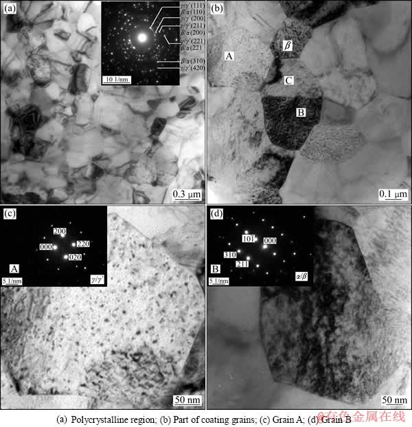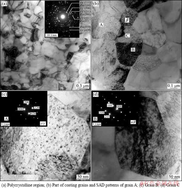 图3所示为NiCrAlY涂层经750 ℃、3 h真空热处理后TEM明场像及选取衍射(SAD)斑点。由图3(a)可知,NiCrAlY涂层经750 ℃、3 h真空热处理后,由于残余应力的消除和元素的再分布,晶界明显,晶粒大小比沉积态更加均匀,其晶粒平均尺寸为300 nm左右。由涂层选区衍射(SAD)斑点(见图3(a)插图)可知:除γ-Ni、β-NiAl、α-Cr相多晶衍射环外,出现了γ′-Ni3Al相(111)、(200)、(211)、(221)及(420)晶面衍射斑点,说明热处理后涂层中形成了γ′相,与XRD谱分析结果相吻合。图3(b)所示为NiCrAlY涂层经750 ℃、3 h真空热处理后TEM局部明场像,其晶粒A和B的明场相及选取衍射斑点(插图)分别如图3(c)和(d)所示。