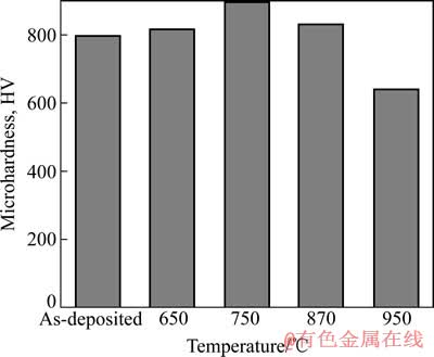真空热处理对NiCrAlY涂层显微硬度的影响如图5所示。由图5可知,沉积态NiCrAlY涂层的显微硬度为798.5HV,涂层经650 ℃、3 h真空热处后,其表面硬度值的提高不明显为815.8HV;当真空热处理温度提高到750 ℃时,涂层表面硬度值达到最大值896.3HV;当真空热处理温度进一步升高时,涂层表面硬度值开始下降:当真空热处理温度为870 ℃时,涂层表面硬度值为830.4HV;当真空热处理温度为950 ℃时,涂层表面硬度显著下降为640.8HV。由图2(c)可知,由于沉积态涂层中沉积残余应力的存在,涂层显微硬度值保持在较高值。由图1、图3(c)和图4(d)的相关讨论可知:涂层经650 ℃、3 h真空热处理后,开始析出γ′-Ni3Al相;经750 ℃真空热处后,γ′-Ni3Al相析出量增加;进一步提高热处理温度至870及950 ℃时,涂层中γ′-Ni3Al相含量明显降低;从Ni-Cr-Al合金中析出的γ′相细小弥散并且与基体保持共格关系,能够强化合金基体。因此,涂层经650 ℃真空热处理后,虽然涂层的残余应力得到释放,但随着γ′-Ni3Al相的析出其硬度还是得到提高。经750 ℃真空热处理后,涂层中γ′-Ni3Al相析出量增加,涂层达到最大硬度值。但随着真空热处理温度的进一步提高,涂层中γ′-Ni3Al相含量明显降低,同时,由于残余应力的充分释放及涂层元素分布的均匀化,涂层的硬度显著降低。文献[24]表明,在700~750 ℃的温度范内,即γ′相脱离母相的温度区间,可以得到最大的沉淀硬化效果。如果温度接近γ′溶解界限时,沉淀过程会中断,沉淀相在原来的地方积聚;如果温度超过固溶度线时,还会引起沉淀相的重新溶解。因此,电弧离子镀NiCrAlY涂层的后续热处理不但是减少涂层沉积缺陷、释放沉积残余应力、均匀化涂层元素及增强涂层与基体的冶金结合的过程,而且是NiCrAlY涂层的时效硬化过程。NiCrAlY涂层最佳的析出硬化效果温度范围为700~750 ℃,NiCrAlY 涂层硬度的提高可改善涂层抗冲刷性能,延长涂层的使用寿命。