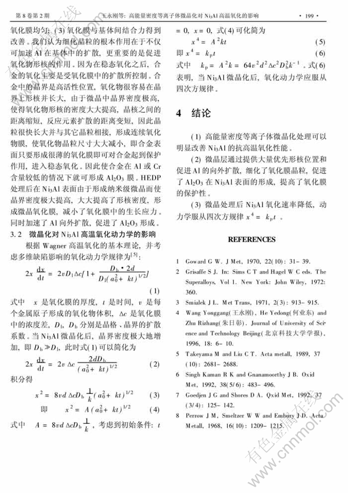 摘 要:应用高能量密度等离子体对Ni3Al进行微晶化处理,在合金表面获得了晶粒尺寸小于300 nm的微晶层。对比研究了Ni3Al微晶处理前后在氧气中1000 ℃高温氧化的行为和规律。发现微晶化处理后的试样氧化膜晶粒被极大地细化,合金中Al选择氧化得到促进,氧化速率明显降低, 氧化动力学服从四次方规律x4=kpt。