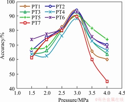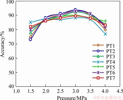 The variation of leak location accuracy with pressure for different approaches is shown in Figures 8 and 9. PT1-7 represent the seven valves detected, and the accuracy represents the percentage of data with accurate diagnosis in the total number of data used for verification. The model has high accuracy near the pressure of the training sample. However, when the pressure changes, the accuracy drops sharply. When the pressure is lower than 3 MPa, the acoustic emission signal is weak; therefore, the acoustic emission signal does not change sharply with the change of pressure,which leads to a relatively small impact on the accuracy. When the pressure is greater than 3 MPa, the friction and collision between the liquid and the pipe are intensified, resulting in a great sound signal, which interferes with the accuracy of micro-leakage localization seriously. Since PT1, PT2 and PT7 are close to the sensor, the signal is collected by the sensor without attenuation of transmission path, therefore, when the pressure is 3.5 MPa, positioning accuracy for three valves is less than 80% and continues to decrease as the pressure increases. When the signal is normalized, the accuracy of the model in a wider pressure range is better and decreases slightly at the pressure at the edge. The normalization model was built using acoustic emission signals under different pressures, and useless signals under different pressures are calculated in the model, which ensures that the accuracy under different pressures can be approximate to the accuracy under 3 MPa. The positioning accuracies of PT1, PT2 and PT7 are significantly improved at 3.5 and 4 MPa. There is a functional relationship between the characteristic values of the AE signal and the system pressure. By the normalization model the usage dimension of the positioning model trained by the training data under a single pressure is extended and the robustness of the localization model is optimized.