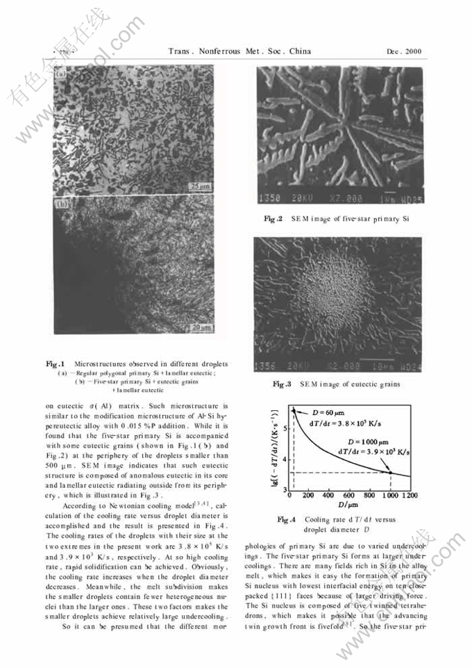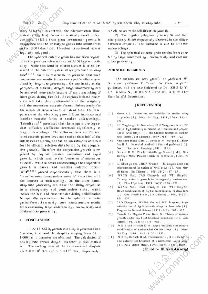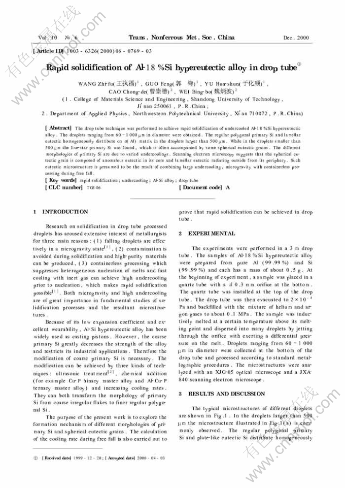 Key words:rapid solidification; undercooling; Al-Si alloy; drop tube