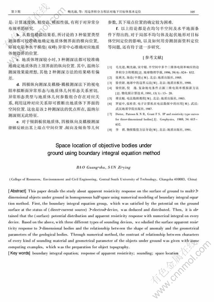 Key words:boundary integral equation; response of apparent resistivity; sounding; space location