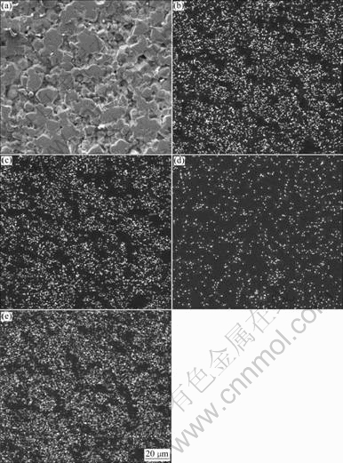 Fig.3 SEM micrograph (a) and distribution of Ni (b), Fe (c), V (d) and O (e) on polished surface of NiFe2O4 with 2.0%V2O5
