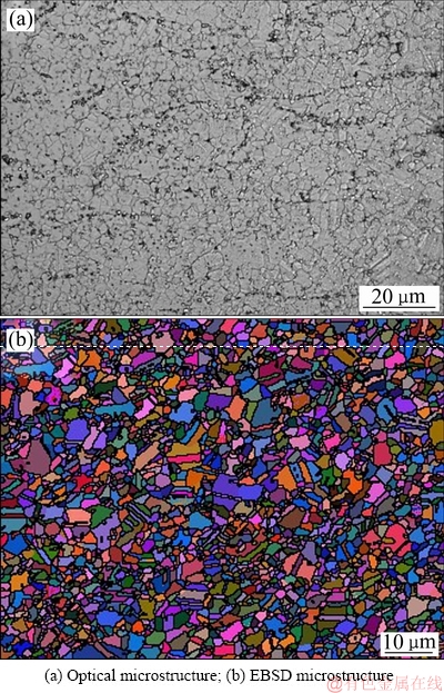 将热挤压-退火态试样和热压缩试样沿轴向剖开,经不同型号砂纸打磨、机械抛光后,采用Kallings溶液(5 g CuCl2+100 mL HCl+100 mL C2H5OH)进行腐蚀。腐蚀后的金相组织在REICHERTMe F3A型光学显微镜上进行观察和分析。将机械抛光后的试样进一步做振动抛光,抛光时间在6~8 h。制备后的样品在配有电子背散射衍射(EBSD)附件(Oxford, Aztec)的FEI Quanta 650型扫描电镜(SEM)下进行,步长设定为0.02~1.2 μm。利用Channel 5软件对数据进行后续处理及分析。