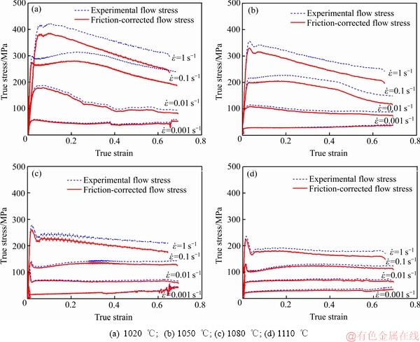 尽管使用润滑剂和石墨片可以减小热压缩变形过程中试样与压头之间的摩擦,但是随着温度的升高和变形量的增加摩擦无法避免,因此本文利用EBRAHIMI等[12]提出的流变应力修正方法,对热挤 压-退火态FGH96合金的真应力-真应变曲线进行了摩擦修正,如式(1)所示: