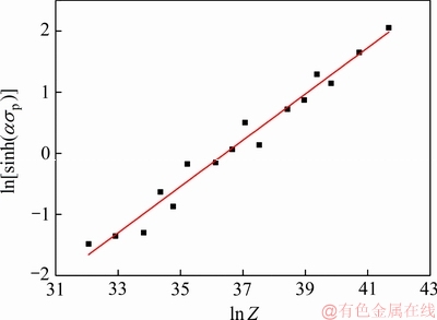 关系图,如图4所示。由图4可见,其线性关系拟合较好,这也验证了利用双曲正弦函数关系建立FGH96合金流变应力本构方程的准确性。