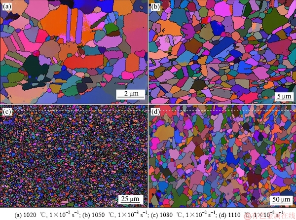 为验证热加工图的正确性,进一步优化工艺参数,利用EBSD对不同变形条件下热挤压-退火态FGH96合金的组织进行了观察。由图8(a)可以看出,经1020 ℃、1×10-2 s-1热压缩后,热挤压-退火态FGH96合金原始晶界周围已开始发生了动态再结晶;合金在1050 ℃、1×10-3 s-1条件下热压缩后,动态再结晶基本完全,且伴随着γ′相的逐渐溶解,再结晶晶粒有明显长大(见图8(b));经1080 ℃、1×10-2 s-1热压缩后,合金中的动态再结晶较均匀,平均晶粒尺寸约2.4 μm (见图8(c));提高变形温度至1110 ℃后,合金中的动态再结晶晶粒明显粗化(见图8(d))。图7中显示的热挤压-退火态FGH96合金的流变失稳区对应于0.1~1 s-1、1020~1032 ℃和1070~1110 ℃变形条件范围内。观察热变形试样的宏观形貌可以发现(见图9),热挤压-退火态FGH96合金的流变失稳与裂纹的形成有关(见图9中红色区域)。分析可知,合金中由碳化物、氧化物等有害脆性相形成的原始颗粒边界(PPB)和热诱导孔洞[23],在热变形过程中易成为潜在的裂纹源,导致裂纹的萌生;在高应变速率条件下,裂纹源迅速得以扩展从而引起宏观开裂。但由于挤压所产生的内应力经退火后得到了较好地消除,故在本实验条件范围内热压缩试样产生的宏观裂纹明显少于未经退火的热压缩试样[17]。综合上述结果,对热挤压-退火态FGH96合金建议的热加工参数为变形温度约为1075~1080 ℃、应变速率约为1×10-3~1×10-1.5 s-1的区域。在该动态再结晶区域内进行热加工,既具有较高的耗散效率又可获得较细小的动态再结晶晶粒。