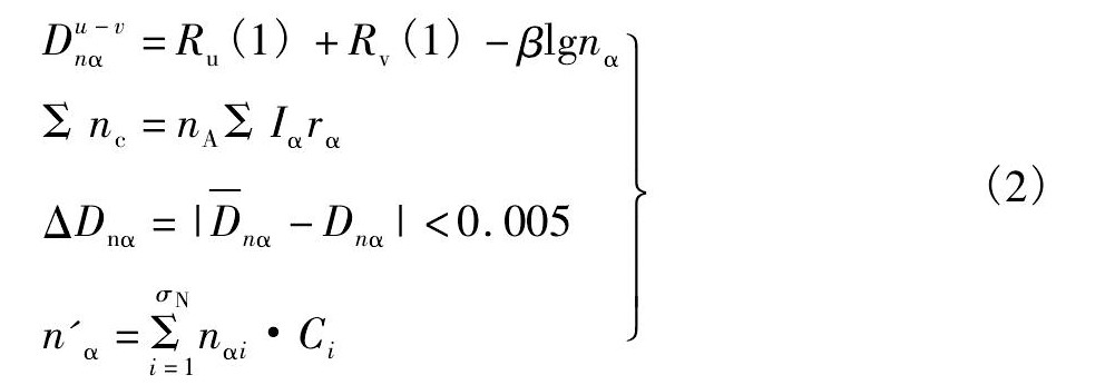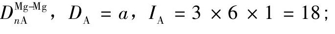 式中,Dnuα- v,Ru( 1) ,Rv( 1) ,Iα与上文出现的字母含义相同; β 为键距参数[8],这里取0. 0710 nm; nα为 α( = A,B,C,D) 共价键上的共用电子对数; nA为最强共价键上共用电子对数; n'α为nα的统计值; nαi为第i种原子组态上的nα值; nc为Mg原子的共价电子数; rα为各键距之差导出以最强共价键上共用电子对数nA为单位的共用电子对数之比,即rα= nα/ nA; σN为晶胞中可能存在的原子状态组数; Ci为第i种原子组态出现的概率,Ci= 1 / σN; nα为成键两原子间形成的理论键距; Dnα为成键两原子间形成的实验键距; ΔDnα为理论键距与实验键距之差的绝对值,即为键距差。由此,利用式( 2) 可计算纯Mg晶胞的价电子结构参数统计值n'A,其结果列于表2。