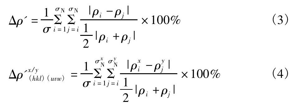 式中,i,j分别为相中原子可能存在的状态; ρi,ρj分别为原子处于第i,j状态时,相晶面上的共价电子密度; x,y分别代表合金中任意的两个相, ( hkl) ,( uvw) 分别代表x,y相中的晶面; ρix,ρjy分别为原子处于第i,j状态时,x,y相界面上的共价电子密度; σN代表相中可能存在的原子状态组数; σNx,σNy分别代表x,y相中可能存在的原子状态组数; σ 为相界面中可能存在的原子状态组数。至此,利用式( 3) ,( 4) 及3. 1,3. 2节中的计算结果可以计算Mg( 0001)/ Mg( 0001),Mg-Zr( 0001)/ Mg-Zr( 0001), Mg( 0001)/ Mg-Zr( 0001)相界面共价电子密度差的统计值,见表4。
