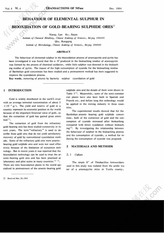 BEHAVIOUR OF ELEMENTAL SULPHUR IN BIOOXIDATION OF GOLD-BEARING SULPHIDE ORES