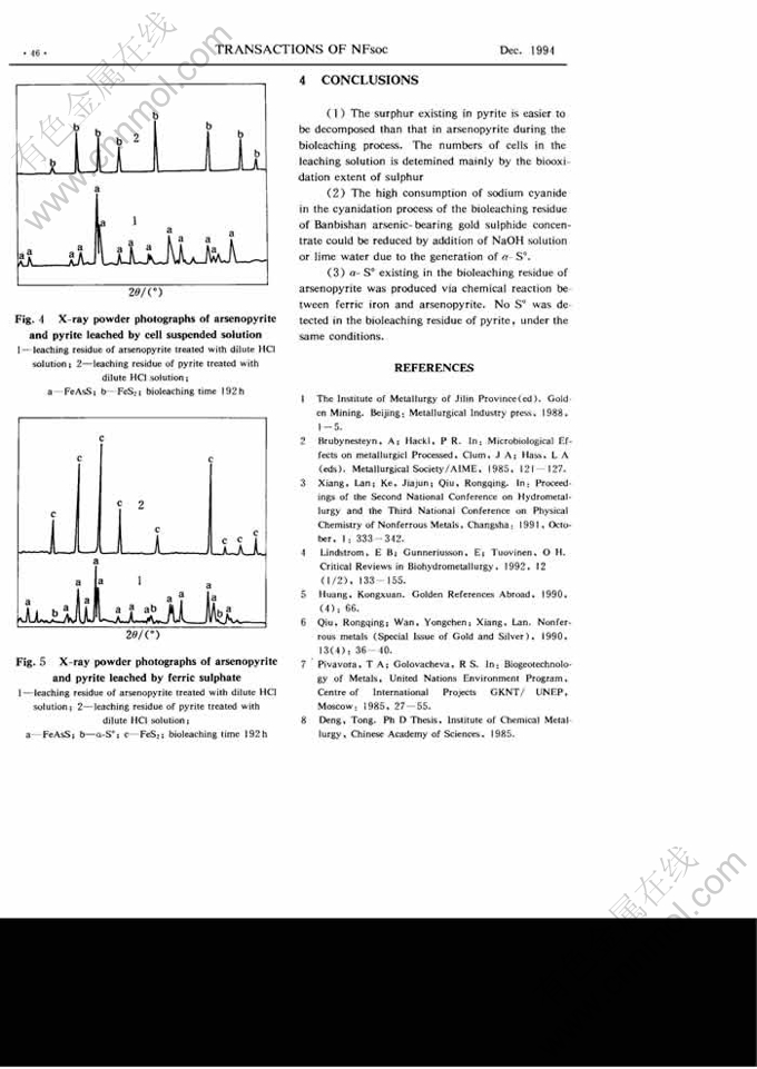 Abstract: The behaviour of elemental sulphur in the biooxidatior process of arsenopyrite and pyrite has been investigated it was found that the α-S0 produced in the bioleaching residue of arsenopyrite was formed by the process of chemical oxidation,while little sulphur was detected in the bioleaching residut of pyrite. The reason of the high consumption of cyanide for the bioleaching residue of Banbishan gold concentrate has been studied and a pretreatment method has been suggested to improve the cyanidation process.