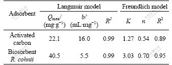 Table 3 Langmuir and Freundlich isotherm parameters for Cd(Ⅱ) biosorption on biosorbent R. cohnii and activated carbon at optimal conditions