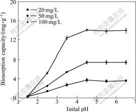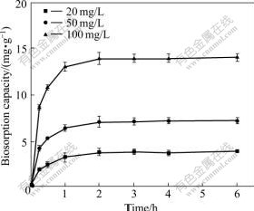 The dosage effect of biosorbent R. cohnii was investigated at initial cadmium concentrations of 20, 50 and 100 mg/L. The uptake of Cd(Ⅱ) decreased with increasing dosages. The maximum uptakes of cadmium were 3.6, 7.3 and 13.7 mg/g at the dosages of 1 g/L (Fig.3).