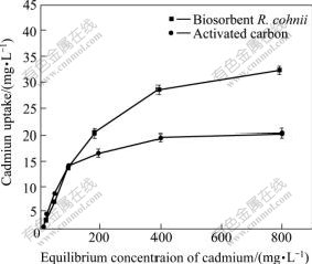 The initial concentration of metal ions in the solution plays a key role as a driving force to overcome the mass transfer resistance between the aqueous and solid phases[25]. Therefore, the sorption capacity was expected to be higher with a higher initial concentration. As shown in Fig.4, the sorption capacity of both adsorbents increased with the equilibrium concentration of metal ions in the solution. The activated carbon performed better sorption capacity than biosorbent R. cohnii when the equilibrium cadmium concentration was below 100 mg/L. However, when the equilibrium cadmium concentration was higher than 100 mg/L, the situation was converse. This indicated the great potential application of R. cohnii as a biosorbent to treat cadmium wastewater at high concentrations.