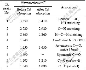 Numerous chemical groups have been proposed to be responsible for the biosorption of metals. They include carboxyl, sulphonate, hydroxyl and amino[31]. Their relative importance in metal sorption may depend on factors such as the quantity of sites, accessibility, chemical state and affinity between site and metal [32-33]. FTIR was an important tool to identify the functional groups. The vibrancy signals before and after biosorption of cadmium were different. The functional groups and the corresponding wave numbers were identified in this study compared with other research [33-35]. The assignment of FTIR bands and detailed wavenumber shifts for the biosorbent R. cohnii are summarized in Table 5. The shift of adsorption peak from 3 350 to 3 410 cm-1 indicated that the hydroxyl group had been changed from multimer to monopolymer or even dissociative state[36], which meant that the degree of the hydroxyl polymerization in biosorbent surface was decreased by the addition of Cd(Ⅱ). It offered more opportunity for Cd(Ⅱ) to be bound to the hydroxyl groups. Another change in the spectrum was the carboxyl. The adsorption peaks around 1 740 and 1 490 cm-1 were not observed after adsorption. In addition, the adsorption peaks were shifted from 1 650, 1 205 and 1 040 cm-1 to 1 630, 1 210 and 1 080 cm-1. This indicated that the carboxylic groups of cell wall biopolymers were active in metal sequestering[37].
