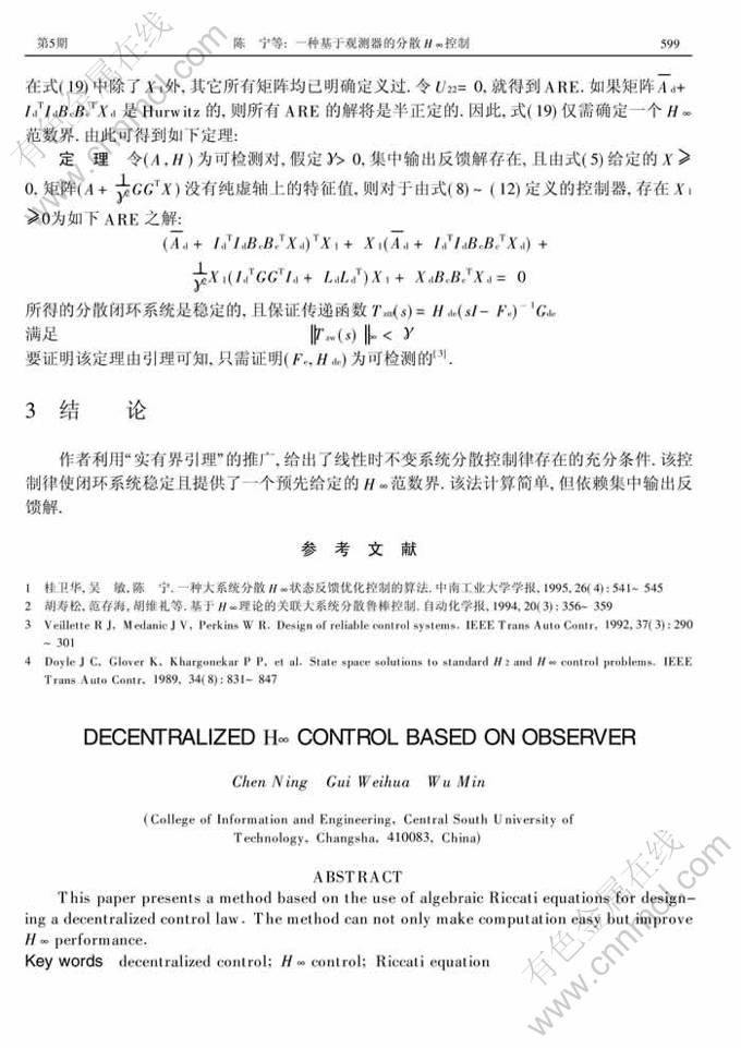 摘 要:提出一种基于代数Riccati方程设计分散控制律的方法.该法不仅计算简便,而且可获得较好的H∞性能指标.