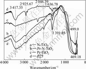 图3所示为N-TiO2、Pr-TiO2、Pr-N-TiO2经450 ℃热处理后样品及P25的傅里叶变换红外吸收光谱。由图3可知,3 417.35 cm-1处的吸收峰为物理吸附水分子—OH的伸缩振动,与物理吸附水有关[7]。2 925.67 cm-1处的吸收峰为TiO2表面水分子通过化学吸附于TiO2表面的振动吸收峰,1 636.78 cm-1处的吸收峰为物理吸附水分解的特征峰。大量吸附水的—OH有利于光催化反应进程,在光照下,—OH可捕获光生空穴(h+)生成羟基自由基(.OH),羟基自由基具有较高的氧化能力[8]。1 391.85 cm-1处的吸收峰为吸附O2分子的特征吸收峰。500~1 500 cm-1区间有一宽而强的吸收带,这是TiO2晶体的Ti—O—Ti键的伸缩振动和变角振动峰[9]。对比曲线a、b和c、d发现,在2 046.39 cm-1处曲线a、b中出现吸收峰,这归属于尿素分子中—NH2弯曲振动和C—H伸缩振动的混合峰。在500 cm-1附近出现的一系列小的吸收峰是Ti—O的伸缩振动,随着Pr和N的掺入,吸收峰向低波数方向移动。对比发现,曲线c在499.0 cm-1处出现微弱的吸收峰应归属于Pr—O键的伸缩振动,曲线b在469.18 cm-1处的微弱吸收峰归属于Pr—Ti—N的伸缩振动[10]。