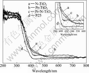 图4所示为经500 ℃热处理后N-TiO2、Pr-TiO2、Pr-N-TiO2及P25的紫外-可见漫反射吸收光谱。由图4可以看出,P25仅在紫外光区有吸收,与P25比较,单掺杂及共掺杂样品的吸收阈值波长均有一定程度的红移。Pr-N-TiO2对可见光的光谱吸收范围介于N-TiO2和Pr-TiO2之间,但其对紫外光的吸收明显强于P25的。Pr-N-TiO2样品的吸收带边红移至470 nm。半导体纳米材料具有较大的比表面积,这就使得其光学性质受表面状态的影响强烈。当半导体纳米材料表面以不同介电常数的材料修饰时,其光学性质将发生改变。这种改变来自于介电限域效应[11]。与纯TiO2相比,Pr的氧化物具有较小的介电常数,使得Pr掺杂纳米TiO2产生介电限域效应。对于Pr-N-TiO2,介电限域效应引起的能量变化大于空间效应(电子和空穴空间限域能)引起的能量变化时,其带隙将明显减小,在吸收光谱上表现为明显的红移[12]。同时,Pr掺杂在TiO2导带底引入杂质能级[13],禁带宽度减小,使其吸收带边发生红移。ASAHI等[14]指出,当少量N原子掺入TiO2晶格,N的2Pn轨道替代O的2Pn轨道的同时与Ti的dxy轨道相互作用。这可在TiO2价带顶引入新的杂质能级,从而使得纳米TiO2带隙减小,有利于纳米TiO2光催化剂对可见光的吸收。