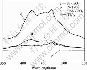 光致发光荧光光谱是检测半导体固相材料光学性质的有效方法。图5所示为Pr、N单掺杂和共掺杂及纯TiO2的PL光谱。由于锐钛矿TiO2的带隙能为3.2 eV,对应的激发波长为387 nm,因此,采用300 nm波长的光作为激发光,以保证TiO2样品被激发。从图5可以看出,Pr、N共掺杂样品与纯TiO2的PL谱型和峰的位置基本相同,说明掺杂没有引起新的发光现象,只是影响了PL光谱的强度。在波长为380~500 nm范围内,TiO2表现出强而宽的发光信号,且分别在约420 nm和470 nm处出现明显的PL峰,这是TiO2在光的激发下所产生的光生电子和空穴复合后发出的荧光[15],共掺杂样品较单掺杂及纯TiO2的PL光谱强度明显降低,表明掺杂后光生电子和空穴的复合率降低,有利于光催化性能的提高。Pr掺杂TiO2能在TiO2导带底引入杂质能级,此杂质能级能够成为光生电子的浅势捕获阱[13];N掺杂可在TiO2价带顶引入杂质能级,此杂质能级能够成为光生空穴的浅势捕获阱,从而使得光生电子和空穴得到有效分离。