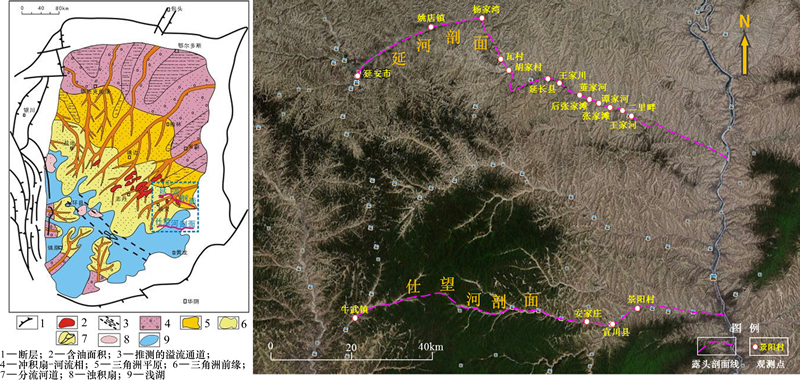 野外露天研究的直观性、大比例尺、高精细度等优点是其他储层构型研究方法所无法比拟的。鄂尔多斯盆地上三叠统延长组在盆地内大量出露,前人对这些露头剖面研究取得的成果,为本文研究奠定了良好的基础。盆地东缘出露的位于延长县的延河剖面和宜川县的仕望河剖面(图1),其剖面整体方向与物源方向近于垂直,且剖面沿开凿的公路连续出露(延伸近 100 km)、地层倾角平缓(倾角小于1°)、剖面延伸距离长,便于大范围追踪对比研究。因此,选取这2条露头剖面进行浅水三角洲储层构型研究。
