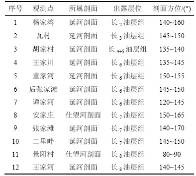优选出2个露头剖面上地质现象丰富、侧向延伸距离长、剖面方向与物源方向近于垂直的12个观测点进行重点研究,分别为延河剖面杨家湾(长2油层组)、瓦村(长3油层组)、胡家村(长4+5油层组)、王家川(长6油层组)、董家河(长6油层组)、后张家滩(长6油层组)、谭家河(长6油层组)、张家滩(长7油层组)、二里畔(长7油层组)、王家河(长8油层组)和仕望河剖面安家庄(长7油层组)、景阳村(长8油层组)(表1)。