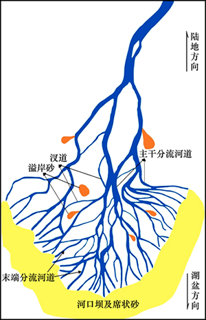 大量的野外露头观察研究发现:剖面上浅水三角洲分流河道规模、分布特征差异较大。为了进一步研究分流河道类型及成因,在露头剖面研究的基础上,结合对鄱阳湖典型浅水三角洲现代沉积[22]的观察,发现分流河道按其平面分布位置和成因,可以进一步细分为主干分流河道(包括深切分流河道)、汊道和末端分流河道3种类型(图2)。