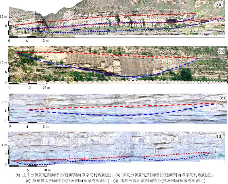 主干分流河道形成了浅水三角洲的主流分流体系(图2),为浅水三角洲沉积体系中规模较大的分流河道。主干分流河道具有较强的下切能力,沉积砂体厚度较大,一般大于3 m(图3(a)),粒度相对较粗,发育槽状交错层理、平行层理等反映较强水动力条件的层理构造,是浅水三角洲分流河道体系中最为常见、分布最广的分流河道类型。而深切分流河道为特殊地质条件下形成的主干分流河道,其下切能力强,能下切若干个单层砂体,砂体厚度较大,最大厚度一般大于10 m(延长县延河剖面谭家河村深切分流河道最大厚度为12.2 m,宜川县仕望河剖面景阳村深切分流河道最大厚度为10.4 m)(图3(b)),与其他类型的分流河道相比,具有较小的宽厚比。一般为较粗沉积物的垂向加积充填,下部发育大型的槽状交错层理,层理规模向上变小,其在露头剖面上特征明显,易于识别。深切分流河道为湖平面下降使得分流河道侵蚀基准面下降,河床坡度变陡,河流发生回春作用所形成,一般发育于长期基准面旋回的底部。整体上,深切分流河道在浅水三角洲沉积体系中较为少见。