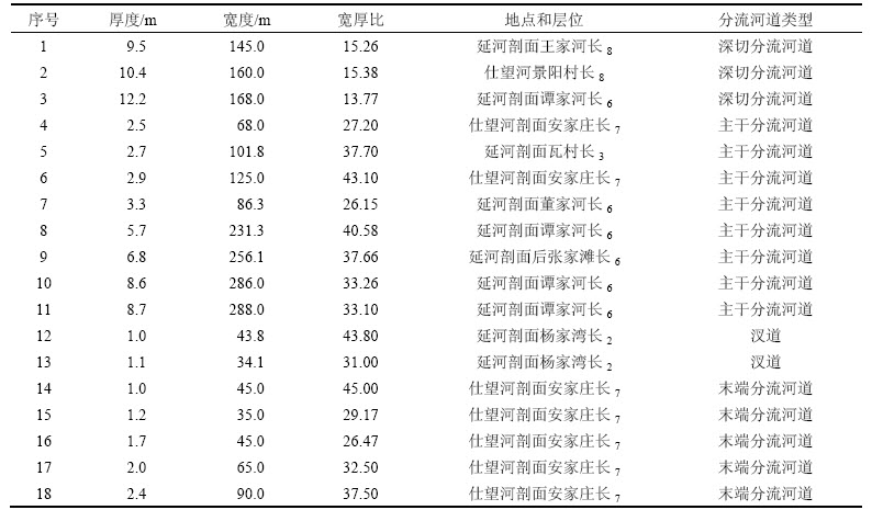 1) 鄂尔多斯盆地东缘延长组湖盆浅水三角洲分流河道按其分布位置和成因可分为主干分流河道(包括深切分流河道)、汊道和末端分流河道3种类型。除深切分流河道外,主干分流河道、汊道和末端分流河道砂体宽度、厚度呈正相关的双对数关系,相关系数高达0.97,即三者宽厚比相近,而深切分流河道宽厚比较小。