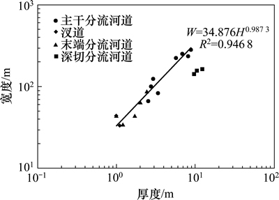 进一步对浅水三角洲分流河道宽度、厚度关系进行了分析。研究发现,除深切分流河道外,其他分流河道的宽度与厚度呈正相关的双对数关系,且相关系数很高,达0.97(见图4,其中,W为分流河道砂体宽度,H为分流河道砂体厚度,R为相关系数),即主干分流河道、汊道、末端分流河道具有相近的宽厚比,且其宽厚比较深切分流河道大,即同类三角洲中不同类型分流河道砂体宽厚比具有差异性。