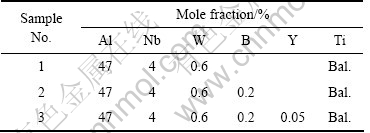 试验合金采用真空非自耗电弧熔炼法制备。各合金的名义成分如表1所列。熔炼用料均采用高纯原料,高熔点元素(Nb、W、B、Y)以中间合金形式加入。为保证合金成分的均匀性,每个合金锭均反复翻转熔炼6次,然后在直径为8 mm的模具中吸铸成为棒状铸锭。以电火花线切割将铸锭沿纵向从中间剖开,然后进行组织分析。
