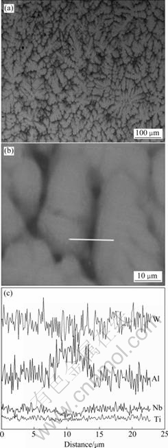 Fig.2 SEM-BSE micrograph for as-cast Ti-47Al-4Nb-0.6W alloy and EDS line profiles showing alloy elements distribution along line in Fig.2(b): (a) SEM-BSE micrograph; (b), (c) EDS line profiles