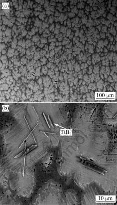 2) 微量B元素加入后,短棒状TiB2相因成分起伏而直接从液相中析出,增加了基体相的非均匀形核部位,从而增大了形核率,降低了铸造Ti-47Al-4Nb- 0.6W合金的晶团尺寸;同时,片层间距也明显减小。