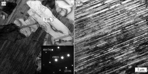 利用透射电镜对铸态Ti-47Al-4Nb-0.6W-0.2B合金中的析出相进行观察及分析(见图5)。衍射斑点标定结果显示该棒状析出物为具有六方结构的TiB2。研究表明[17],TiAl基合金中硼化物类型与Al含量有 关,当Al含量大于44%(摩尔分数)时,凝固过程中仅形成TiB2。本研究结果与该报道一致。另外还发 现,B元素加入后,γ/α2平均片层间距有所减小,约为200 nm。