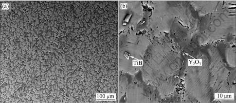Fig.6 SEM-BSE images of as-cast Ti-47Al-4Nb-0.6W-0.2B-0.05Y alloy: (a) Whole microstructure; (b) Microstructure of precipitation
