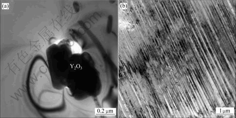图6所示为合金3的扫描电镜背散射电子像。由图6可以看出,加入微量Y元素后,铸态Ti-47Al-4Nb- 0.6W-0.2B-0.05Y合金的平均晶粒尺寸进一步减小,可达到25 μm左右(见图6(a)),这一尺寸要明显小于文献报道的单独加入B或单独加入Y所获得的铸态晶粒尺寸(分别为40 μm[18]和60 μm[16]);同时,在晶内和晶界还存在颗粒状析出物(见图6(b))。进一步的透射电镜观察及能谱分析结果显示(见图7(a)),该析出相中富集了Y和O,其摩尔比约为2?3,可以判断该析出相为Y2O3,这一结果与文献报道的微量Y加入TiAl合金中形成Y2O3的研究结果相符合[19]。由图7(b)可见,Y元素的加入更进一步细化了γ/α2片层结构,其平均片层间距在100 nm左右。