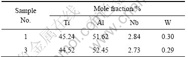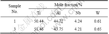 表2和表3所列为1#和3#铸态合金主要相成分的能谱分析结果。从表2和3可以看出,微量B和Y的加入对合金中主要相γ相及γ/α2相的成分影响很小。