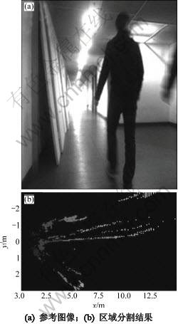 在获得地面区域之后,对图像进行立体分割。其目的是找出图像中竖直的物体。首先将立体匹配后获得的三维点云投影到二维栅格化的水平面上,得到点云在水平面上的二维累加直方图。然后,对该直方图进行区域分割,得到水平面上一系列的连通区域。图2(b)所示为区域分割后的结果,不同的灰度表示不同的连通区域,观察点处于原点,方向向右。最后分割好的连通域中的像素将被逆向投射到原图像中。