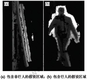 采用相关匹配算法进行模板匹配,见式(2)。同时利用非极大值抑制方法保证选择出一定邻域内的最大值。所选区域将作为行人存在的假设区域。此时假设区域中的图像已经消除了尺度的影响。图3所示为立体分割算法生成的2个检测区域。