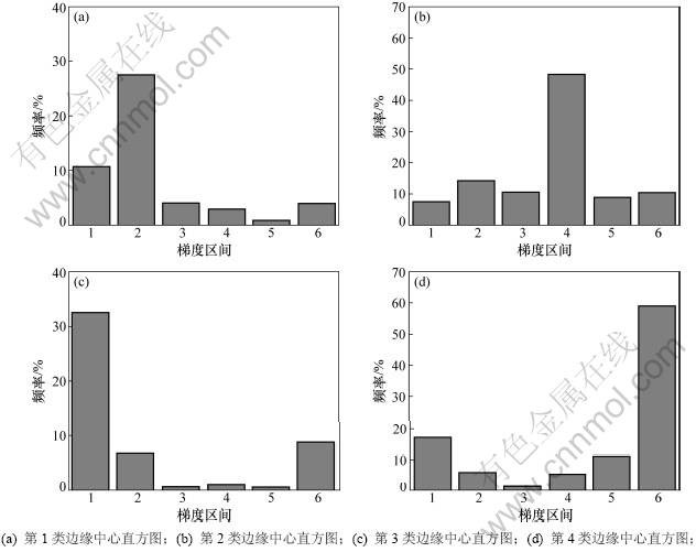 图5所示为聚类学习后4类边缘类型中心的直方图分布。可以看出,聚类的结果很明显地将一定区域内的边缘像素点按照其走向分为水平,竖直以及两个对角线方向4个类别。
