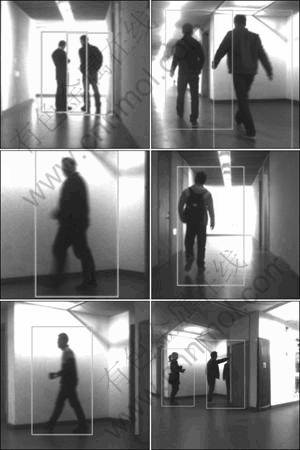 在第2个实验中,自行构建数据库对整体算法进行验证。通过操控机器人在研究大楼中不同地点收集到4组图像,每组图像包含大约300张人体正样本图像及若干负样本图像。不同组数据分别采集自一天的不同时段。图9给出了部分检测结果的截图。