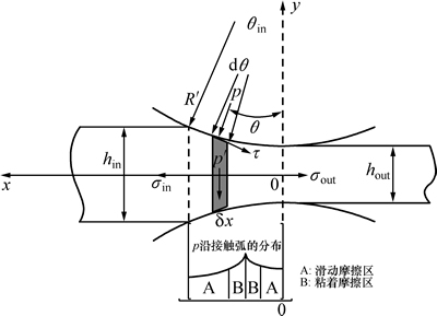 式中:p为单位压力;p′为单位压力的垂直分量;τ为摩擦应力;θ为任意微元的接触角;h为任意微元的高度;hin和hout分别为轧件入口厚度与出口厚度;σin和σout分别为入口张力与出口张力。式(1)和(2)构成了微元在垂直方向与水平方向上的力平衡方程。