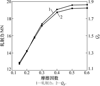 图5所示为轧制力与应力状态系数Qp随着摩擦因数的变化。从图5可见:轧制力与应力状态系数Qp开始都随着摩擦因数的增大而增大,当摩擦因数增加到一定程度时,两者的增加效果都不再明显。这是因为轧制变形区内的摩擦发生变化,逐步由滑动摩擦过渡到粘着摩擦。本仿真实例中,当摩擦因数从0.15增加到0.50时,轧制力从12.7 MN增大到19.6 MN,变化非常显著。因此,若能适当采取措施提高轧制区的润滑效果,减小摩擦因数,则可以有效降低精轧带钢的轧制力。