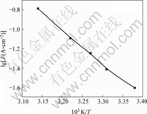 可计算出交换电流密度J0。通过实验测定了23~45 ℃范围内的交换电流密度J0,均在10-5 A/cm2的数量级。将lg J0与1/T作图,根据直线的斜率得到平衡电位下的表观活化能为70.04 kJ/mol。