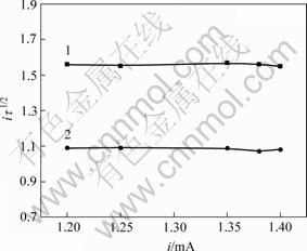 对i作图,若得到平行电流坐标的直线,则表明电极反应不伴随有表面转化反应;否则表示有表面转化反应。当温度为25 ℃、阶跃电流i为1.2 mA时所得到的电位-时间关系如图3所示。由图3可知,曲线上有2个阶梯,对应着2个过渡时间τ,分别为τ1=1.69 s,τ2=0.83 s,表明在阴极大量析出氢气之前发生了2个平行的电荷传递反应,Cr3+的还原分2步进行。随着阶跃电流的增大,τ逐渐减小。图4所示为在不同阶跃电流下所得到的i~