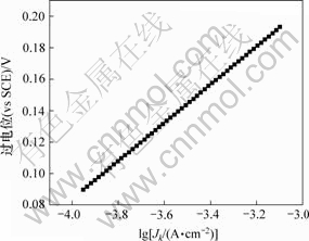 =0.49,由截距求得交换电流密度J0=2.02×10-5 A/cm2。 同理,根据Cr3+溶液中Cr阳极溶解的稳态极化曲线和对应的阳极Tafel斜率(0.024),得到阳极过程的表观传递系数
