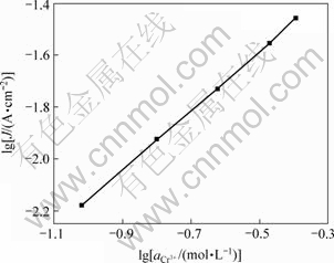 与电流密度J的对数关系如图10所示。图中直线斜率为1.14,所以,Cr3+电沉积的阴极反应级数为1.14≈1。同理,改变溶液中Cr3+的活度,分别测量阳极稳态极化曲线,在Tafel区的某一恒定电位下,得到Cr3+的活度与电流密度的对数关系,由直线的斜率求出Cr3+的阳极反应级数为0.045≈0。
