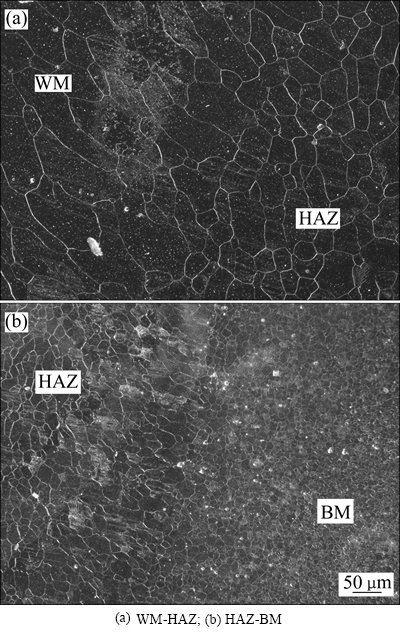 图5所示为MB8镁合金对接接头的金相组织。从图5(a)可以看出,焊缝金属(Weld metal, WM)为典型的铸造柱状晶组织。焊接过程中,由于焊接温度高于熔点,熔合线区域的液态金属在母材晶粒表面形核的同时,晶核以柱状晶的形态向焊缝中心长大。从图5(b)可以看出,热影响区(Heat affected zone, HAZ)的晶粒为不规则的等轴晶,它是由于变形晶粒在变形储存能的驱动下,发生再结晶,晶粒在晶界处重新形核长大而形成的。母材(Base metal, BM)晶粒尺寸比热影响区晶粒明显减小,两者之间有明显界限,界限处的晶粒在再结晶过程中容易软化,会降低晶界的致密程度,使得该区域在焊接残余拉应力的作用下容易萌生微裂纹,从而降低焊接接头的力学性能。