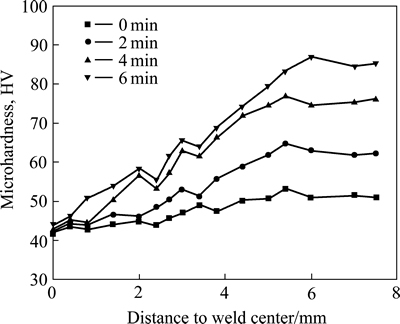 为了研究超声冲击对MB8镁合金焊接接头表面硬化作用,对原始焊态以及不同冲击参数下的接头各区域的表面显微硬度进行测定,根据所得试验数据,绘制接头表面硬度分布图,如图10所示。由图10可知,由于原始焊态接头的焊缝及热影响区晶粒尺寸大于母材晶粒的,显微硬度值均低于母材,母材区最大硬度值为53.2 HV。经过超声冲击处理后,镁合金焊接接头焊趾区(主要是热影响区和母材)的表层硬度有了大幅度的提高,随着冲击时间的增加,硬度变化呈递增的趋势。冲击时间为2、4和6 min时,对应的接头焊趾表层最大硬度依次为64.7 HV、76.9 HV和86.8 HV,比原始焊态的最大硬度分别提高了21.6%、44.5%和63.2%。这是由于接头焊趾区表面经超声冲击处理后,产生明显的塑性变形层,可获得尺寸远小于原始粗晶的纳米晶粒,硬度增加是加工硬化和细晶强化的共同作用。