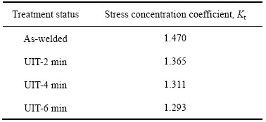 采用相同的网格单元及同样的加载情况下,其他冲击参数对应的接头Kt计算结果如表4所列(表4中Kt值为每组3个试样的计算结果平均值)。从图11和表4可以看出,应力主要集中在原始焊态接头焊趾处,经超声冲击处理后,应力集中系数Kt随着冲击时间的增加而不断减小。冲击时间为2、4和6 min时,对应的Kt降幅依次为7.14%、10.82%和12.04%。超声冲击技术通过增大接头焊趾过渡半径,可以有效减小应力集中系数,从而提高接头的力学性能。