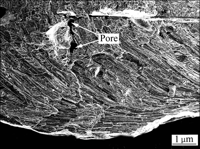 图13所示为MB8镁合金对接接头的拉伸断口形貌。由图13可看出,断口存在大量高密度短而弯曲的放射状撕裂棱,同时伴有解理台阶以及小刻面。局部撕裂棱上分布有尺寸较浅、大小均匀的等轴韧窝。因此,可以判断MB8镁合金焊接接头的拉伸断裂机制为介于解理断裂与韧性断裂之间的准解理断裂,超声冲击并不能改变接头的断裂机理,但可以增强其塑性和韧性。图14所示为焊缝断口的气孔形貌(白色箭头指的是气孔)。由图14可看出,拉伸过程中,气孔将作为应力集中源起作用,而成为裂纹萌生源,同时降低了接头横截面的受力面积,导致焊接接头的力学性能显著降低。